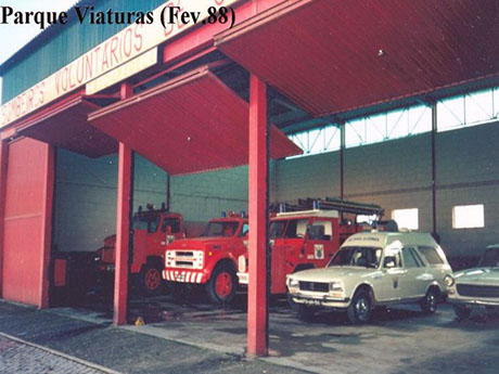 An old apparatus line of this FD (1982 pic ?). Featured: MAN chassis for the future Tanker/Water carrier shown in H03/H04 + FIAT AM + Land Rover Utility jeep (AA ?; probably donated by the Portuguese Navy‟s Sea Rescue Agency) + Morris mini AC + Chevrolet APS (FF-07-82; donated by the ex-BSB, where it was operated new in 1972; see also H03). The latter is identical to the one donated by the BSB to the VFD of Ajuda-C92.