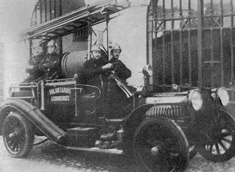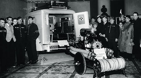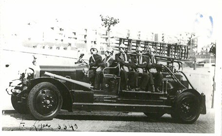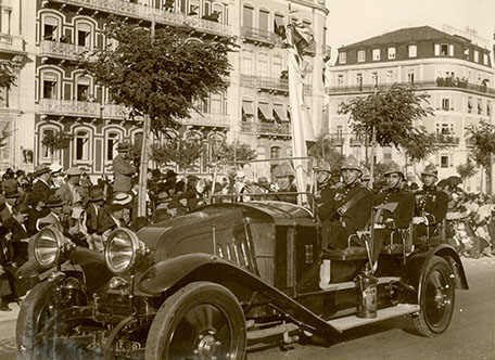 APS; a typical “war-time apparatus”: in D06b (a 1940 picture) note the air-filter masks for the 8 seating crew and the low-expansion foam nozzle in the driver-side front fender, which reflected the overall preparations to deal with potential chemical and incendiary bombing conditions…This rig shows in the Portuguese movie “Pai Tirano” (by A.L. Ribeiro; 1941): it is the 1st on scene of a few apparatus responding to the “fire”, at the end of the movie. In D06c the APM/PSL Rolls Royce featured in D04 and D05 can be seen inside the Fire House, in a rear-bay position. See also in D06c the former public fire alarm bottom on the wall of the Fire Station for the so-called “door report” (D06c).