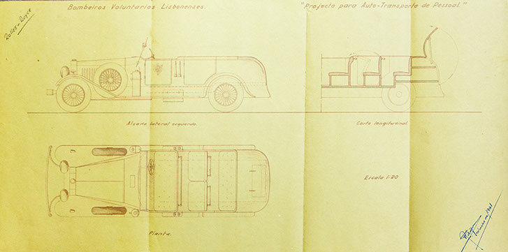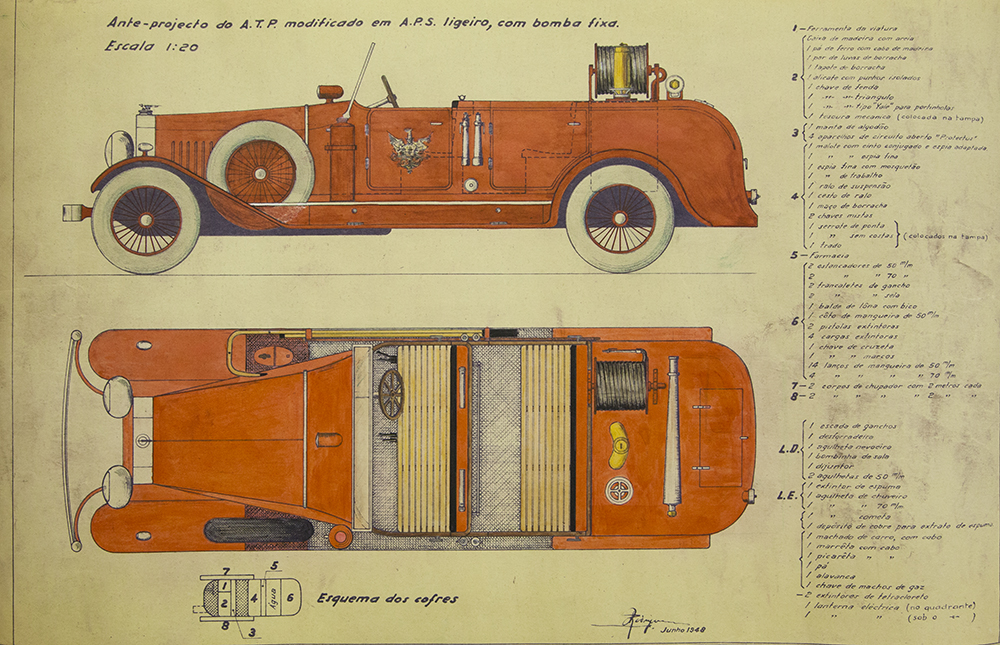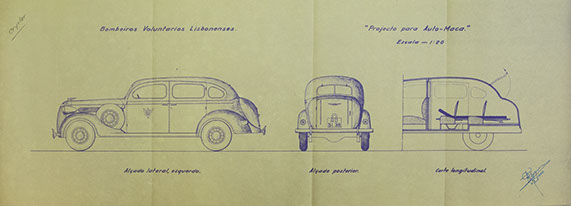 ADC; esta viatura peculiar, de natureza muito rara em Portugal, figura nas imagens rebocando uma MBR com carretel de mangueira de lona apenso. O projecto de adaptação pelos BV Lisbonenses (imagem D07c), a partir de um veículo comercial comum, reflecte um perfil de intervenção tipo “Defesa Civil”, ie: associável a um contexto com ameaça de guerra. Carga (visível parcialmente em D07b e D07c): escada + macas ligeiras (uma semi-fixa, para transporte de sinistrados no própria viatura) + máscaras anti-gás (filtro) e “outros meios de protecção e socorro em contexto de guerra química” (sic).