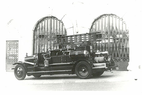 APS; viatura típica de um “tempo de guerra” reflectindo o especial relevo conferido na época aos meios de intervenção adaptados a contextos de guerra, com recurso a bombas químicas e incendiárias. Não apenas toda a guarnição de 8 homens representada em D06b (foto de 1940) é portadora de máscaras de filtro mas também se prevê a possibilidade de combate a fogos especiais mediante o uso de espuma (vide difusor de baixa expansão sobre o guarda-lamas frontal esquerdo); este veículo é um dos que figuram nas cenas finais do filme português Pai Tirano (A.L. Ribeiro; 1941), sendo a 1ª viatura que se vê comparecer no local do “sinistro”. Vide, também, na foto D06c, a frente do APM/PSL Rolls Royce (D04/D05) dentro do quartel. Notar ainda, em D06c, o avisador público na parede do quartel, para “partes de porta”.