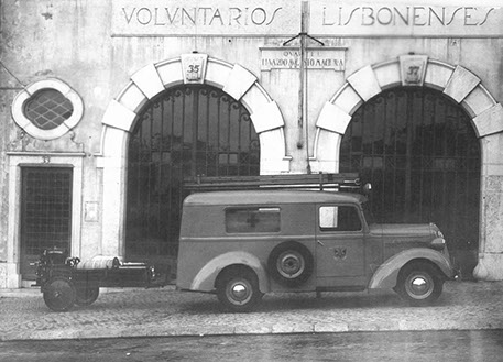 PSM; This mobile first-aid station (co-funded by the Calouste Gulbenkian Foundation) is similar to the ones also operated, in the same period or later, by the VFDs Campo de Ourique-E07, Cruz de Malta-F12, Ajuda (no image) and Lisboa (yet to be confirmed). To be noted: hanging from the wall inside the Fire Station the Portuguese Style wooden hooks ladder (4-meters long when unfolded)