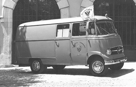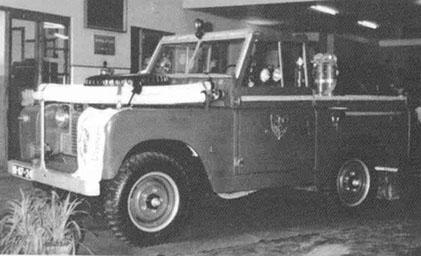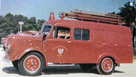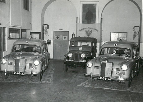 This set of vehicles was inaugurated in 1960: one Willys jeep, ex-Portuguese Army (GH-12-62); AM#5 (Mercedes-Benz 180; LC-82-22) and AM#6 (Mercedes-Benz, LC-72-26). The ambulances sport the international Red Cross symbol (see history of this FD). Note: hanging from both walls inside the Fire Station the Portuguese Style wooden hooks ladder (4-meters long when unfolded)