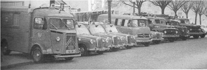 Frota dos anos 60 alinhada no passeio em frente ao quartel; facilmente identificáveis nesta foto os veículos aqui ilustrados como (esq.-dtª): D17, D15, D12, D16 e D18; fotografia provavelmente tomada entre 1965 e 1968