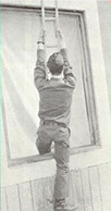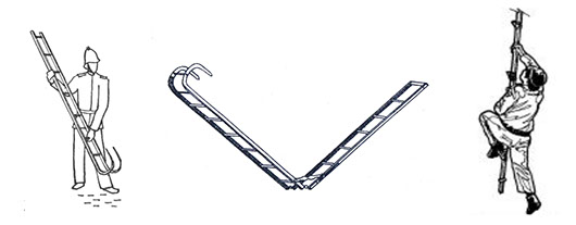 Escada de ganchos portuguesa (para acesso a janelas e varandas em pisos elevados): em madeira resistente e 2 ganchos metálicos; com 13 degraus, compreende 2 secções interligadas com cerca de 2m cada; para transporte uma delas rebate sobre a outra.