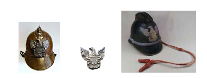 Capacetes de Bombeiro - modelo antigos (latão e couro, este com cordões de desfile; escudo típico-a Fénix ; o modelo em latão era usado pelos CBVs e o modelo em couro pelo BSB, em qualquer dos casos sempre com as insígnias próprias de cada um destes CBs