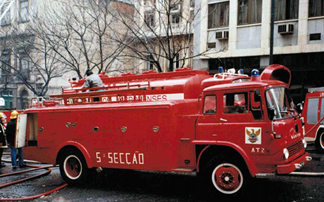 AT2; cedido pelo ex-BSB (vide A44, embora aqui sem modificação do sistema de cofres; viaturas idênticas também foram cedidas aos BVs de Lisboa-B17 e Ajuda-C11); de notar a inscrição de grande relevo “5ª Secção” (terminologia respeitante à tipificação como Secção Auxiliar do ex-BSB); foto em serviço num incêndio urbano importante, no ano de 1992 (data desta foto); em 2º plano, encoberto: um AT dos BV Lisbonenses em actuação no mesmo sinistro (notar a cobertura do motor deste, aberta para arrefecimento)